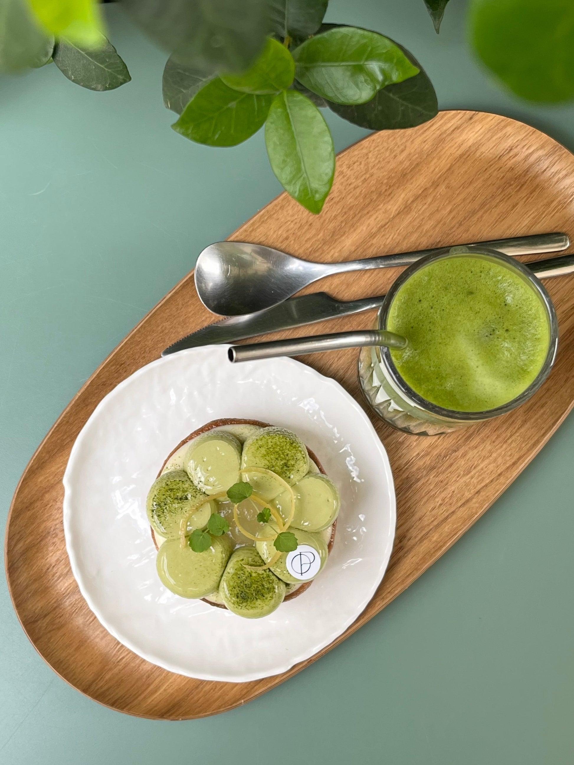 Pâte sucrée, biscuit Matcha, crémeux bergamote, crème matcha, gel bergamote et citron.