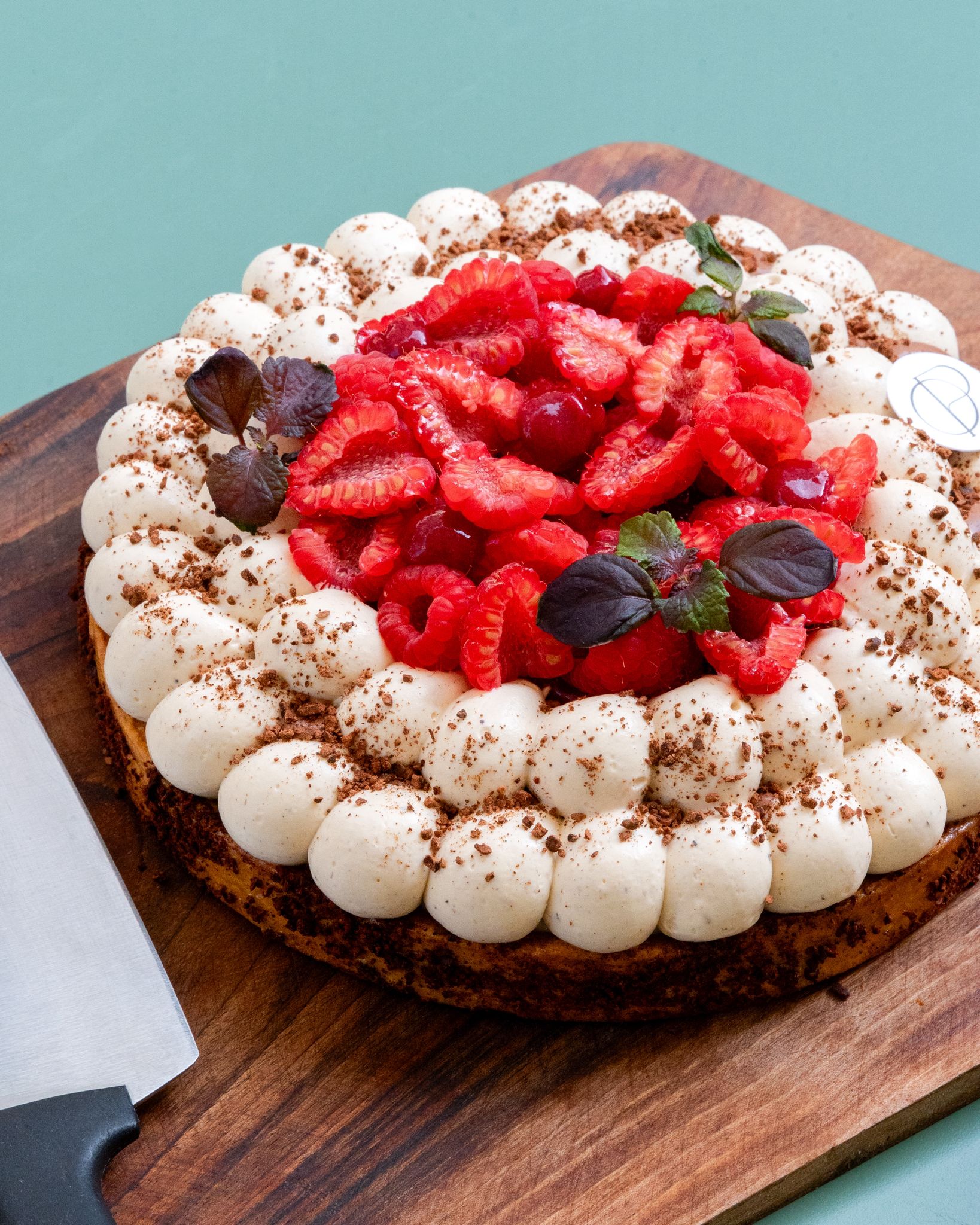 Pâte sucrée, biscuit café, crème légère au café Bourbon rouge, ganache fondante café et chocolat noir, confit framboise et framboises fraiches.