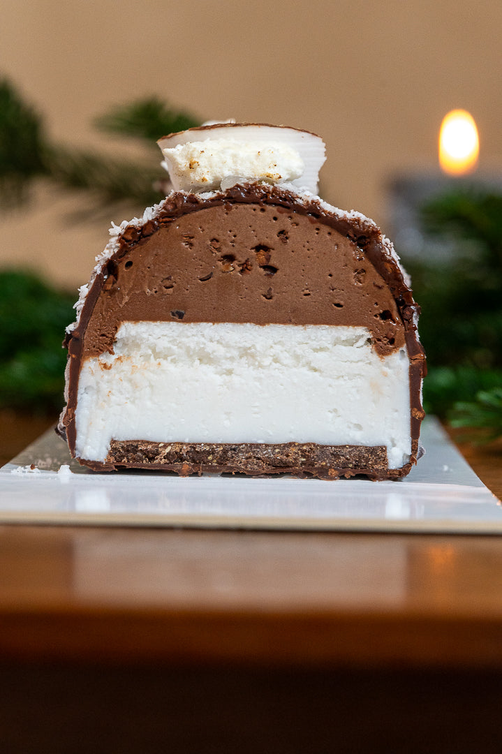 Toute la gourmandise d’un Bounty revisitée en bûche glacée vegan, entre chocolat grand cru et noix de coco fondante.
