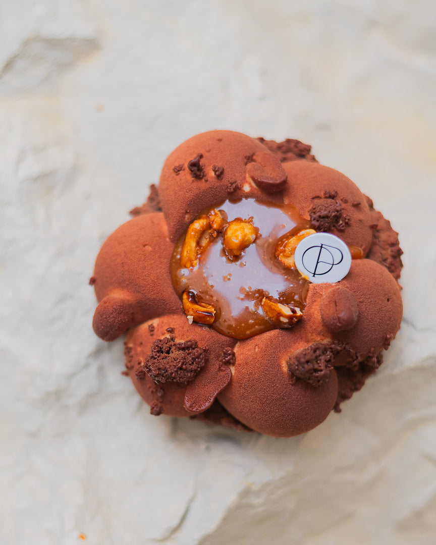 Croustillant chocolat cacahuète, crème cacahuète, caramel beurre salé, praliné cacahuète, cacahuètes