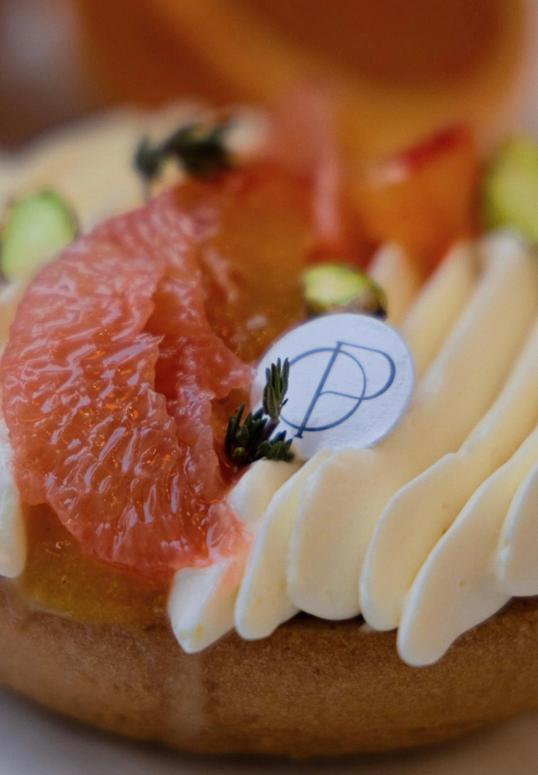 Pâte sucrée, crème citron, biscuit pistache, praliné pistache, crème infusé au thym, marmelade de clémentine corse, suprêmes d’agrume selon arrivage.