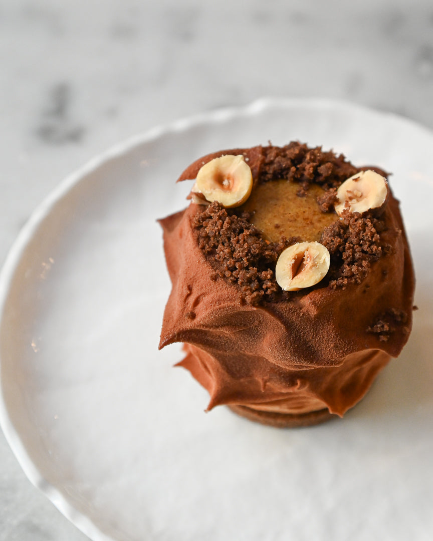 Croustillant chocolat grué et fleurs de sel, biscuit fondant chocolat, praliné noisette à l’ancienne, mousse chocolat noir, crème infusé au grué de cacao.