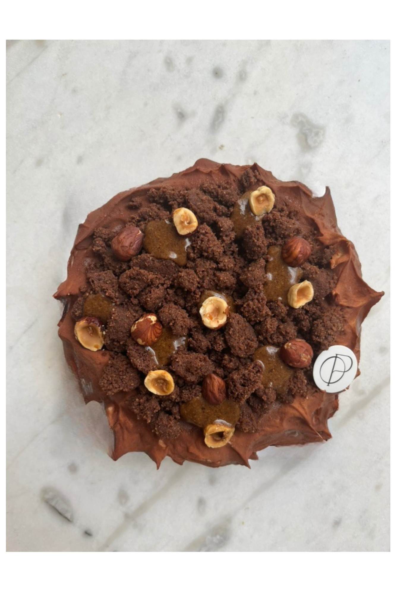 Croustillant chocolat grué et fleurs de sel, biscuit fondant chocolat, praliné noisette, mousse chocolat noir, crème infusé au grué de cacao.