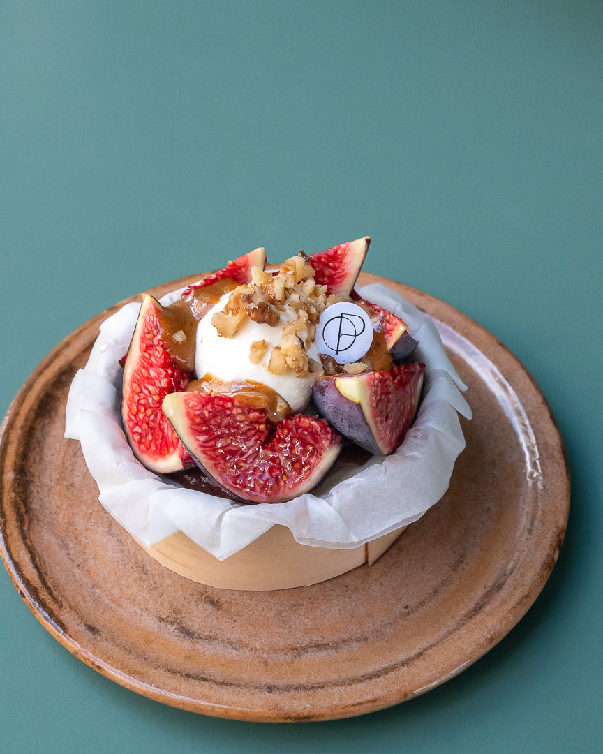 Biscuit noix, mousse fromage blanc, confit figue, praliné noix, chantilly au miel, figues fraîches et éclats de noix.