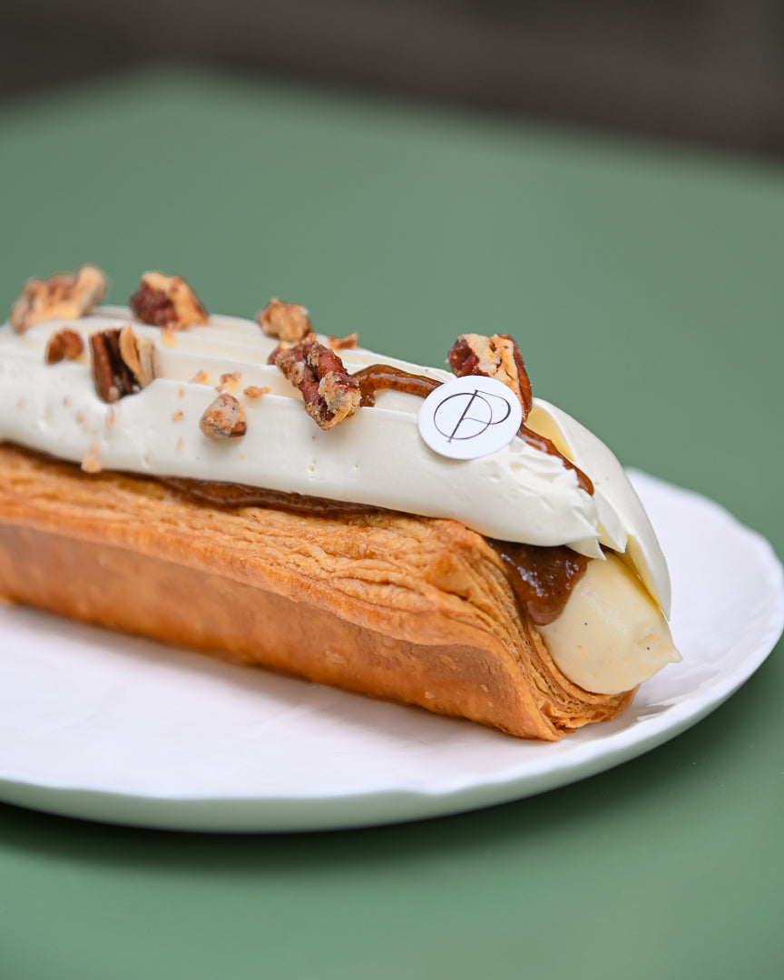 Pâte feuilletée inversée, crème diplomate vanille Madagascar, crème légère vanille, praliné noix de pécans, noix de pécans sablées.