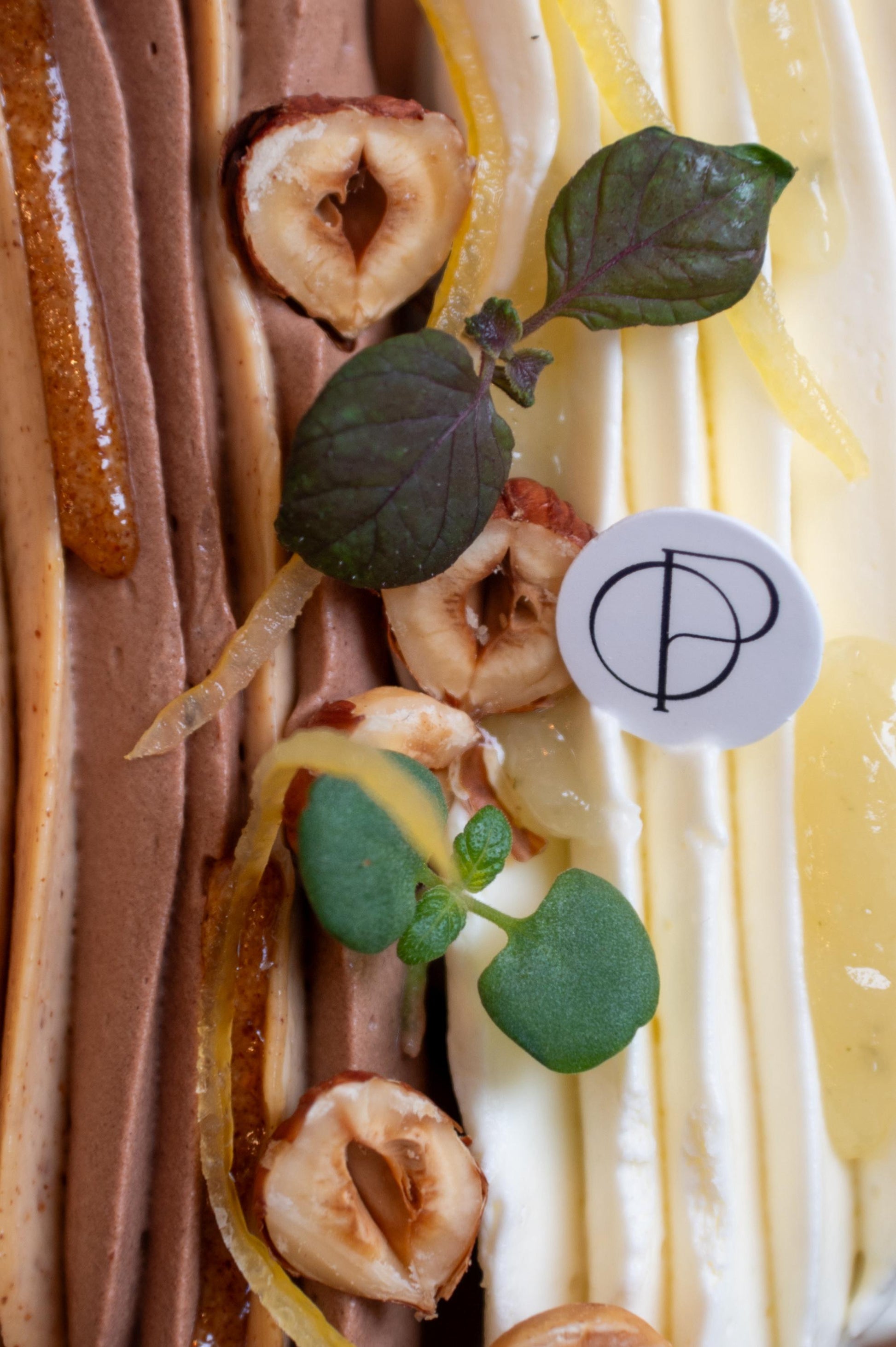 Biscuit noisette, croustillant feuilletine praliné noisette, ganache montée chocolat noir fumée, crème noisette du Piémont, insert praliné noisette coulant, tuile chocolat noir