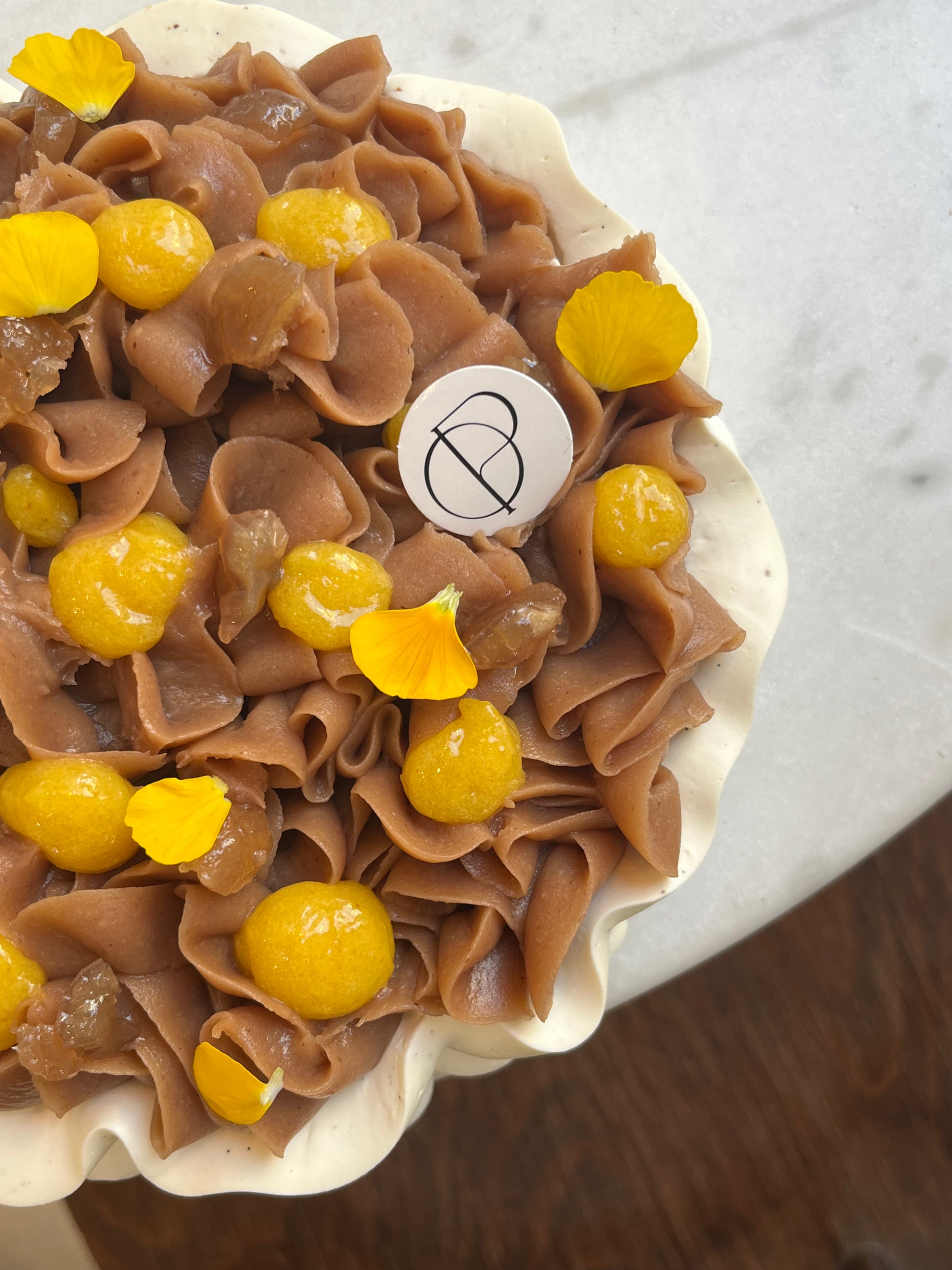 Base meringue croustillante, crème à la vanille de Madagascar, confit mandarine, marmelade de clémentine, appareil marron et brisure de marrons confits.
